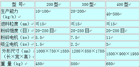 該機由加料斗,分級輪,粉碎刀片,齒圈,粉碎電機,出料口,風葉,集料箱,吸塵箱等部分組成,物料由加料斗進入粉碎室,通過高速旋轉的刀片進行粉碎,調節分級輪與分級盤的距離來達到所要求的物料細度,高速旋轉的風葉把達到要求的物料從粉碎室引到集料箱布袋中,沒有達到要求的物料繼續在粉碎室中粉碎,集料箱布袋產生的粉塵由吸塵箱收集,該機組結構簡單,操作清理方便,噪音小,產量高,機器采用不銹鋼材料制作,粉碎過程中無粉塵飛揚。