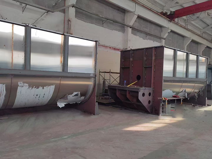 臥式螺帶混合機(jī)是應(yīng)用廣的單軸混合機(jī),半開(kāi)管狀筒體內(nèi)的主軸上盤(pán)繞蝸旋形式且成一定比例的雙層螺帶。盤(pán)旋的螺旋帶依附主軸運(yùn)轉(zhuǎn),能推使物料隨螺旋帶蝸旋方向行進(jìn)。混合機(jī)臥式筒體底部中央開(kāi)設(shè)出料口,使筒體內(nèi)物料出料無(wú)死角。