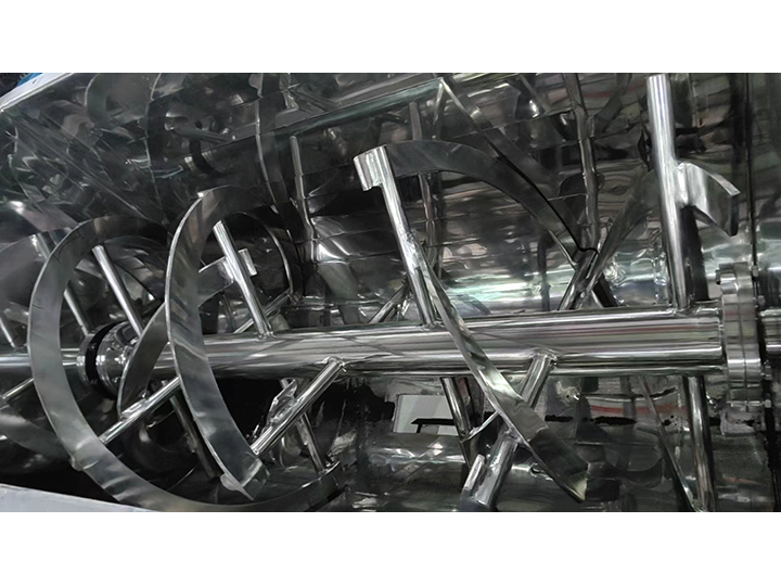外螺旋帶盤(pán)繞形式配合旋轉(zhuǎn)方向把物料從兩端向中間推動(dòng),而內(nèi)螺旋帶把物料從中間向兩端推動(dòng),形成對(duì)流混合,物料在相對(duì)短時(shí)間內(nèi)混合均勻,設(shè)備應(yīng)用于干粉、顆粒、液體與低粘度的漿料。