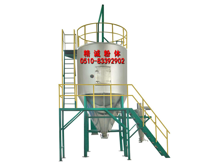 空氣通過過濾器和加熱器,進入干燥器頂部的空氣分配器,熱空氣呈螺旋狀均勻進入干燥器。料液由料液槽經(jīng)過濾器由泵送至干燥器的離心霧化器,使料液噴成小的霧狀液滴,料液和熱空氣并流接觸水分迅速蒸發(fā),在短時間內(nèi)干燥為粉末狀成品。成品由干燥塔和旋風分離器排除,廢氣由風機排出。